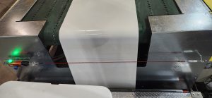 Next, a cable-operated switch, which functions as an emergency stop, was installed at the Rewind end of the line. Operators could also take advantage of the device’s E-stop button, located at knee-level, for additional safety control.