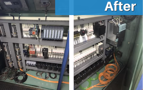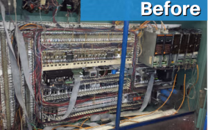 EDC retrofitted three legacy Indramat TDM servo drive motors with three new state-of-the-art Siemens 1FT7 servo motors with integrated DC brakes, and integrated DRIVE-CLiQ with a single-turn absolute position encoder. The new motors have an integrated DC brake that gets powered on the same cable that powers the motor. The DRIVE-CLiQ system interface is an innovative, high-performance interface that supports simple data communication among the converter components. It speeds installation and commissioning while virtually eliminating wiring errors.
