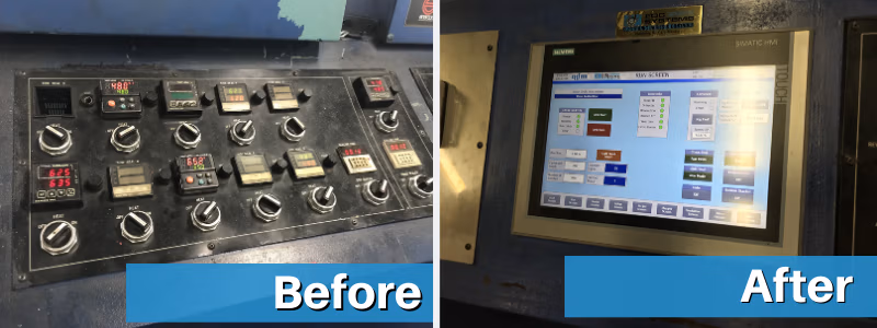 In order to address downtime and restore the envelope converting machine’s typical production rates, EDC recommended retrofitting the envelope converting equipment with a state-of-the-art PLC-based motion control system with new motors and drives. In addition, EDC recommended replacing the operator’s cumbersome variety of push buttons, knobs, dials and meter controls with a new simplified user-friendly touch screen HMI. Some improved mechanical modifications to the clamp section and the implementation of a heater lane robotic set-up helped to add to product quality and increase OEE (Overall Equipment Effectiveness).