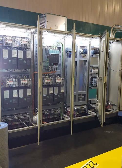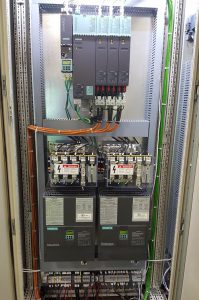 Chuck: “For traversing, we converted the hydraulic cylinder technology into electric linear actuators using servo motors with ball screw drive technology to achieve high thrust forces while maintaining the ability to produce repeatable, programmable motion. We also replaced all the variable speed drives in their cabinets and their PLC using Siemens S-120 vector, S-120 servo and S7-1500 for the PLC. For the operator interface, we used a Siemens Comfort Panel touchscreen human machine interface (HMI). We created a custom mechanical design, so they could very easily pull out the hydraulic cylinders and put in this electric actuator. The new electrically powered system was able to provide thousands of pounds of thrust with the linear actuator and then we interfaced it with the traverse winder controllers that we had upgraded a while back.”