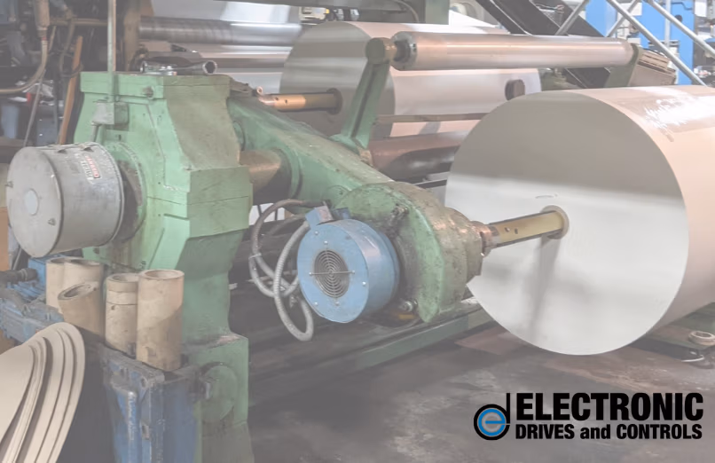 In-depth mechanical design was required for a load cell roll addition and pneumatic brakes to be integrated into the two unwinds, replacing the older electro-magnetic brakes. Even more difficult was converting the OEM’s integrated rewind spindle DC motors and gear train to off-the-shelf AC vector motors and gearheads utilizing the existing cast housings. Since the turret’s slip rings could not carry all the signals needed for the new controls, wireless ethernet communications were used between the rewind drives, mounted on the turrets themselves, and a nearby remote I/O enclosure.